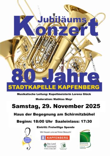 Die Stadtkapelle Kapfenberg lädt recht herzlich zum Jubiläumskonzert anlässlich 80 Jahre Stadtkapelle zum Jubuläumskonzert.